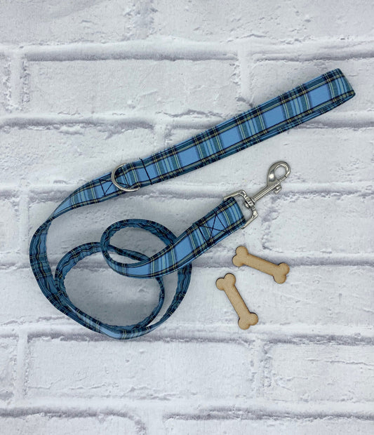 powder blue tartan dog lead handmade in cornwall