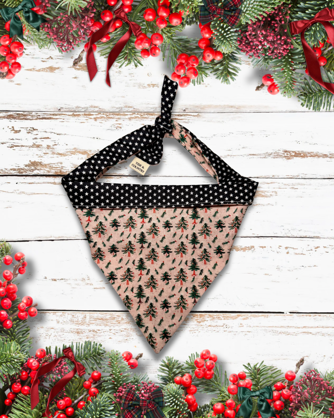 Christmas trees on pale pink with a black star reverse, one of our Christmas best sellers.