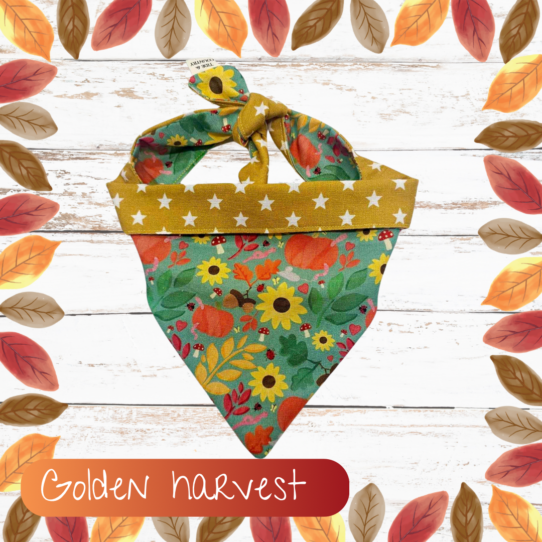 In all our bandanas we offer them in the tie up style (great for dogs that wear a harness) or the collar slide style (the collar slide through the bandana- great for larger or growing dogs.)